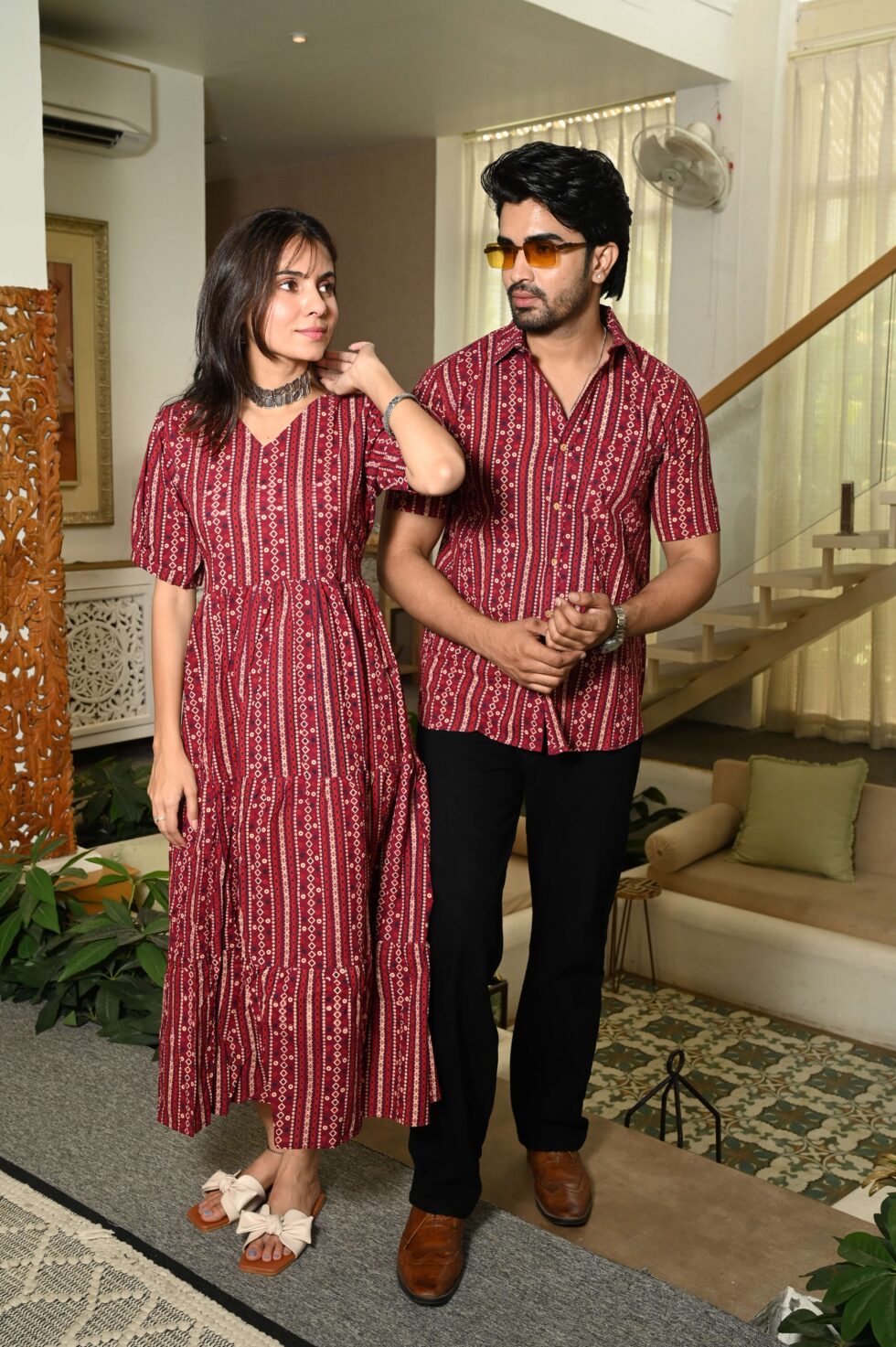 A bold maroon cotton set featuring vertical stripe patterns with dotted ethnic detailing. The button-down dress with 3/4 sleeves and collared shirt create a perfectly coordinated casual yet festive outfit for couples.